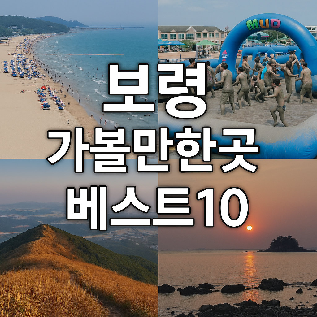 충청남도 서해안에 위치한 보령은 '머드축제의 도시'로 잘 알려져 있으며, 대천해수욕장과 오서산, 섬 관광 등 풍부한 볼거리와 즐길 거리가 있는 곳입니다. 바다와 산, 문화와 축제가 함께 어우러져 사계절 내내 여행객에게 인기가 많습니다. 이번 글에서는 보령 가볼만한곳 베스트10을 정리해 소개하며, 위치·운영시간·안내전화는 물론 계절별 추천 코스, 전통시장, 맛집 정보까지 꼼꼼히 담았습니다.