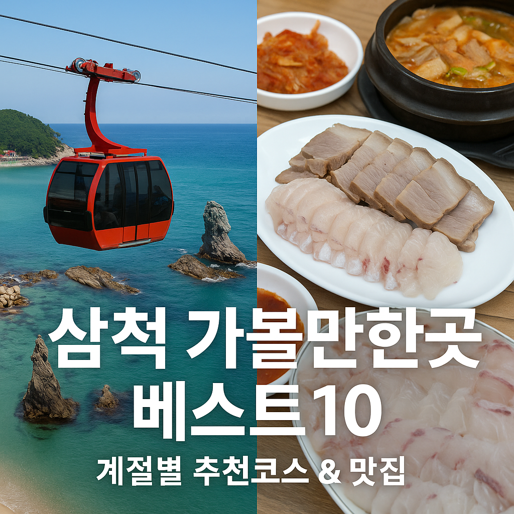 삼척은 강원도 동해안 남부에 위치한 도시로, 바다·산·동굴이 어우러진 천혜의 자연환경과 다채로운 해양 레저, 전통시장과 맛집이 공존하는 여행지입니다. 특히 해상케이블카와 장호항, 환선굴 같은 유명 명소부터 숨겨진 해안길과 맛있는 해산물 요리까지, 사계절 언제나 방문할 이유가 충분합니다. 이번 글에서는 삼척 가볼만한곳 베스트10과 함께 계절별 추천 여행코스, 그리고 꼭 들러야 할 맛집 정보를 정리했습니다.