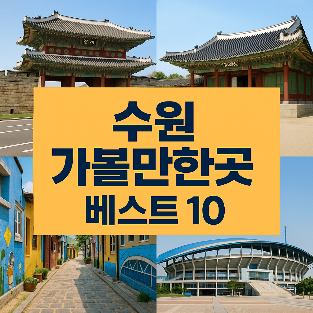 경기도의 중심 도시 수원은 세계문화유산 화성, 다양한 먹거리, 현대적 문화공간이 어우러져 여행객에게 늘 사랑받는 도시입니다. 이번 글에서는 수원 가볼만한곳 베스트10을 선정해 소개하며, 위치, 운영시간, 안내전화는 물론 계절별 추천 여행코스, 전통시장, 맛집 정보까지 정리했습니다.